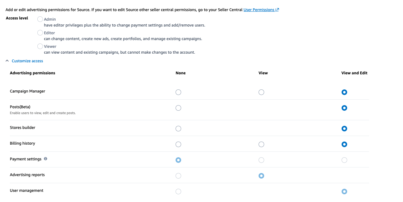 - If you see issues with SourceMedium displaying an advertiser profile you think is attached to a specific account, check your Seller Central account Campaign Manager permissions in addition to the Advertising console. Selecting the permissions within the Advertising console will automatically set them in Seller Central