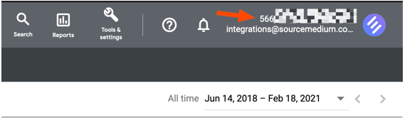- Navigate to find your Account ID on the upper right hand corner of your account share your Account ID credentials with SourceMedium by emailing integrations@sourcemedium.com