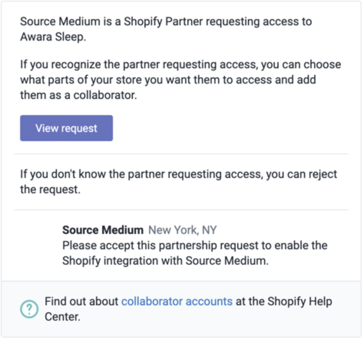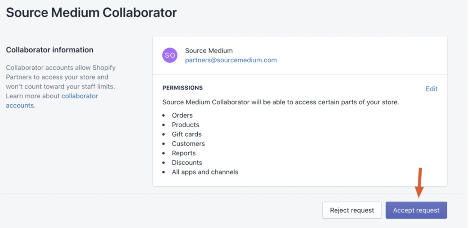 - A partner invite from partners@sourcemedium.com will be sent to your Shopify store owner’s email inbox