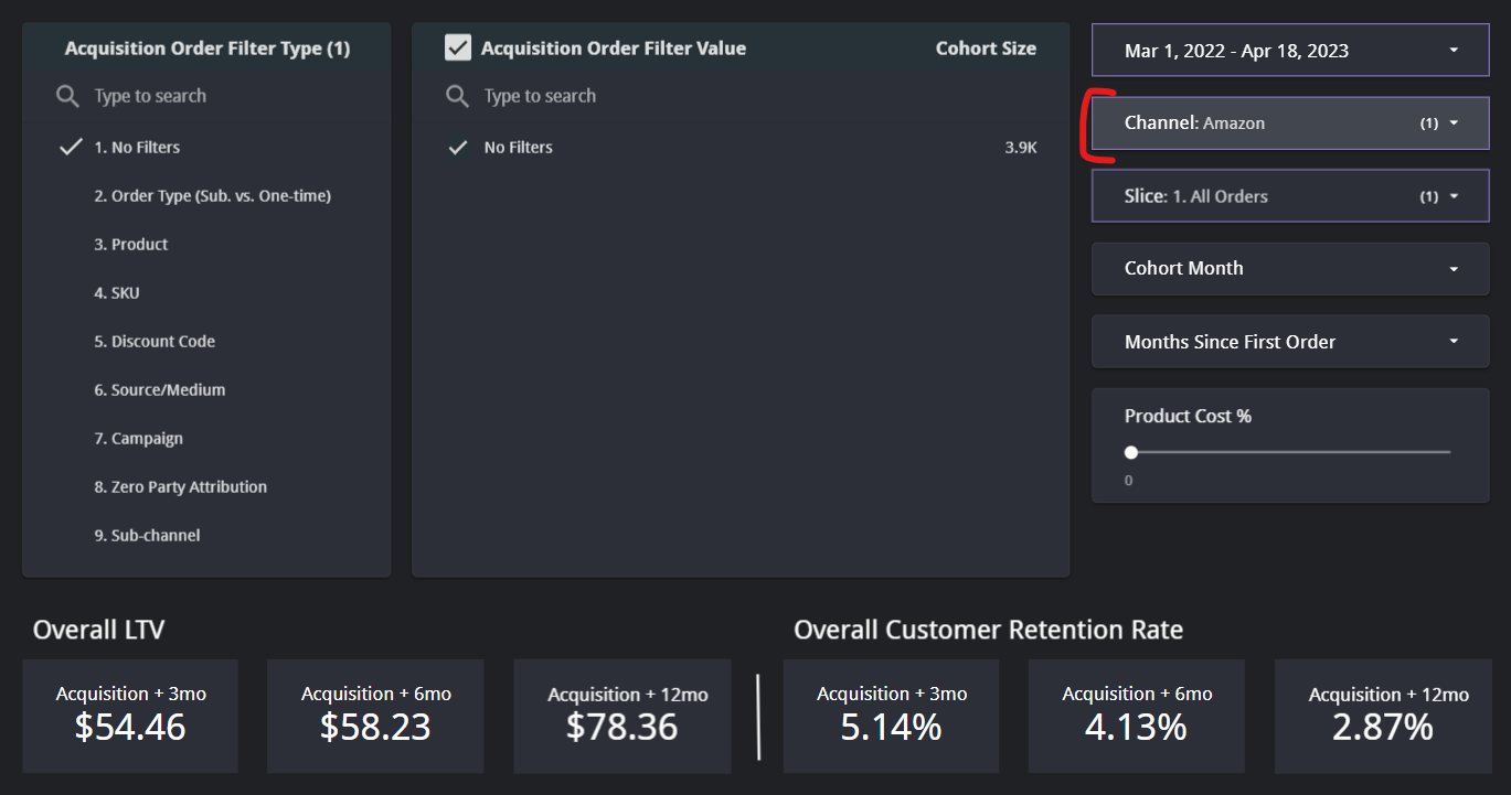 Our LTV & Retention dashboard is an immensely powerful way to understand the lifecycle of your customers, from their first purchase on. This can help you optimize your customer experience by seeing where customers become dedicated fans or drop off. To use this view with your Amazon data, just select Amazon as a channel: