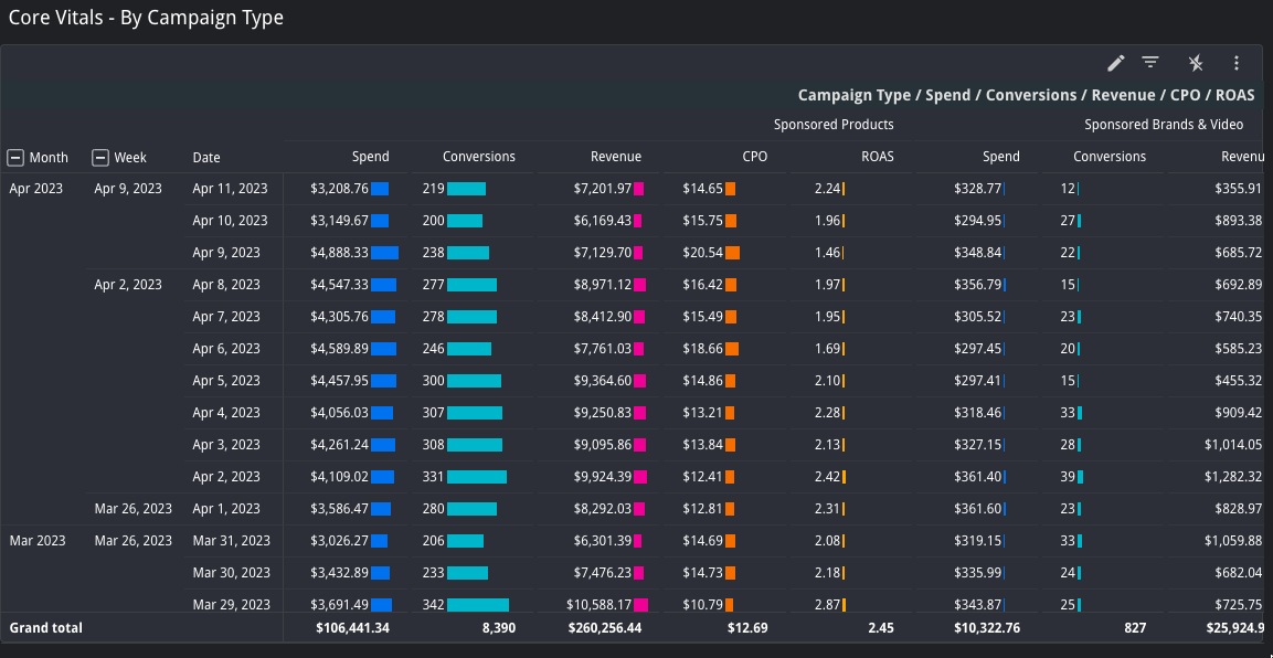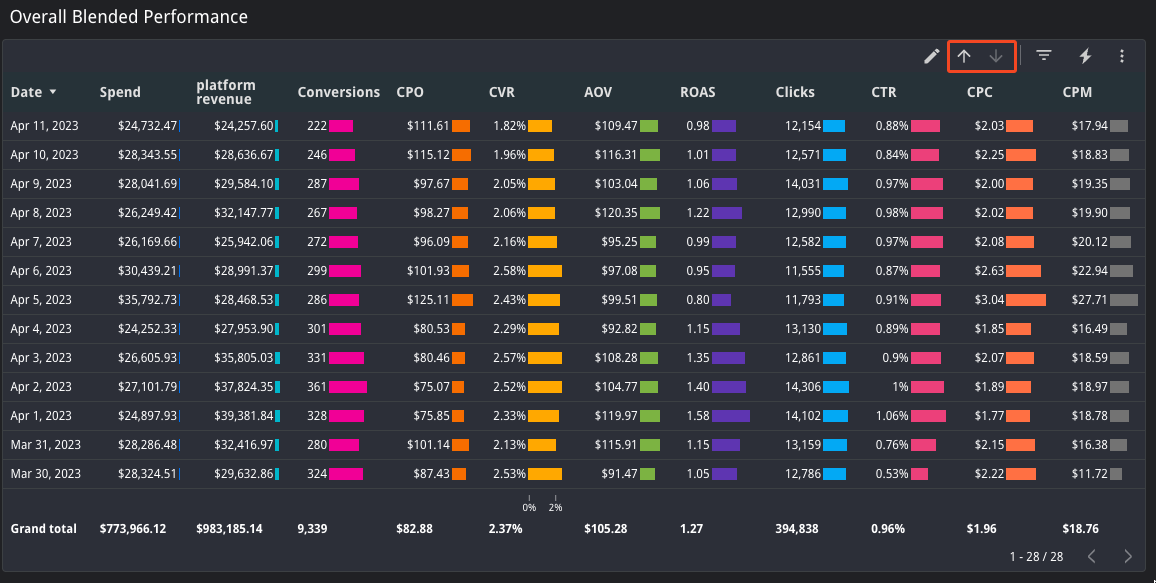 The Overall Blended Performance table summarizes all platform performance metrics.If you would like to switch this summary from daily to weekly, monthly, quarterly, or yearly granularity, use the arrows in the top right of the table to drill up or down to your desired granularity. Just make sure the Date Rage you have selected encompasses you desired level of granularity.