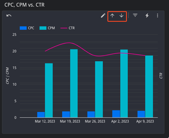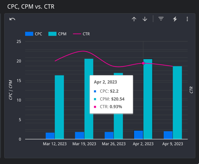 There are various graphs as the bottom of the page showing your marketing performance in terms of Spend, CPO, CVR, etc.All of these graphs have the ability to adjust the granularity from daily to weekly, monthly, quarterly, or yearly granularity. You can adjust granularity by using the arrows in the top right of the table to drill up or down to your desired level. Just make sure the Date Rage you have selected encompasses you desired level of granularity.Hover your mouse over a day on any graph to see a box appear with more detailed information.Shown here is the CPC, CPM vs. CTR graph, shown at the weekly level of granularity.