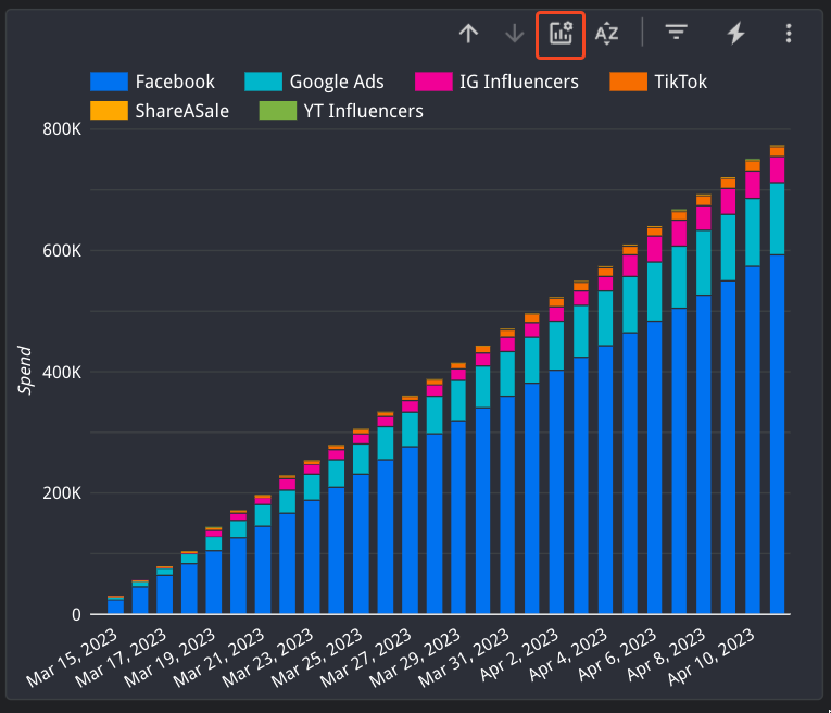 The cumulative and non-cumulative Performance by Platform & Campaign Type graphs show performance by platform on the left and by campaign type on the right.These performance graphs also allow you to change the performance metric shown. Click Optional Metrics button to select your desired performance metricThe bar graphs default to Spend and the time-series line graphs default to ROAS.