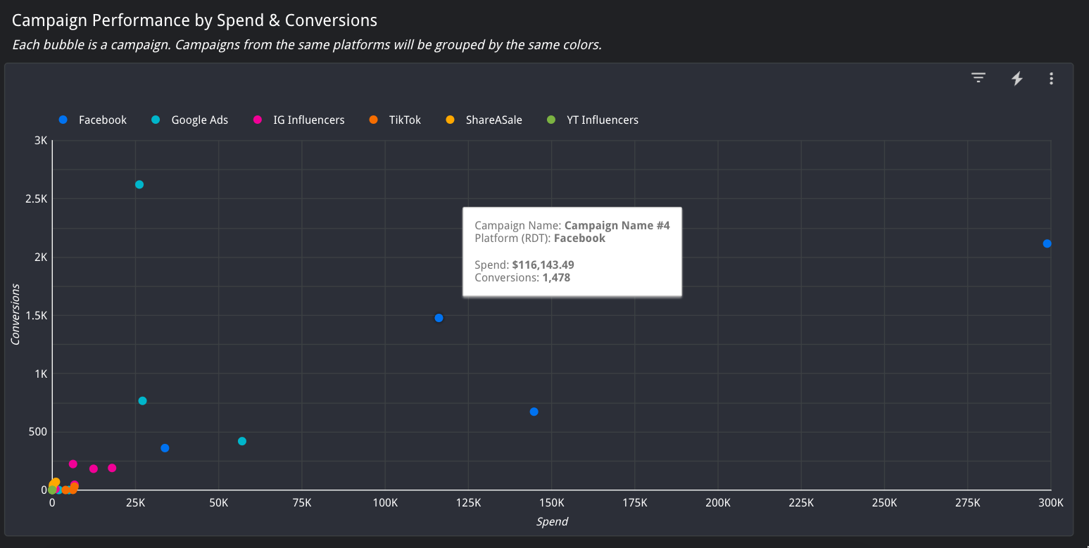 Campaign Performance by Spend & Conversions groups campaigns from the same platforms in the same color, and visualizes them by Spend vs. Conversions.