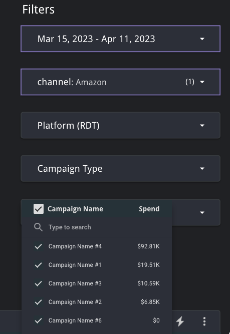 Platform (RTD) filter allows you to select between Amazon Ads and Amazon DSP.All platforms for a given channel are selected by default.