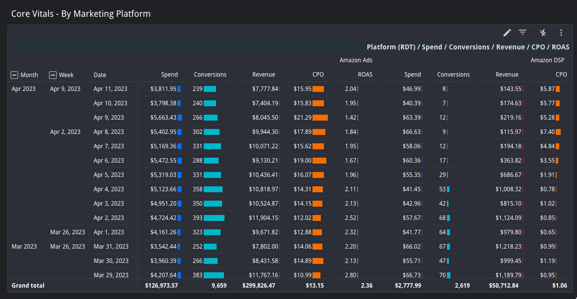 This table shows your platform Spend, Conversions, Revenue, CPO (Spend / Orders), and ROAS (Net Revenue / Spend) by day for each of your marketing platforms.You can look at the results for more platforms (in this case Amazon DSP) by scrolling to the right.