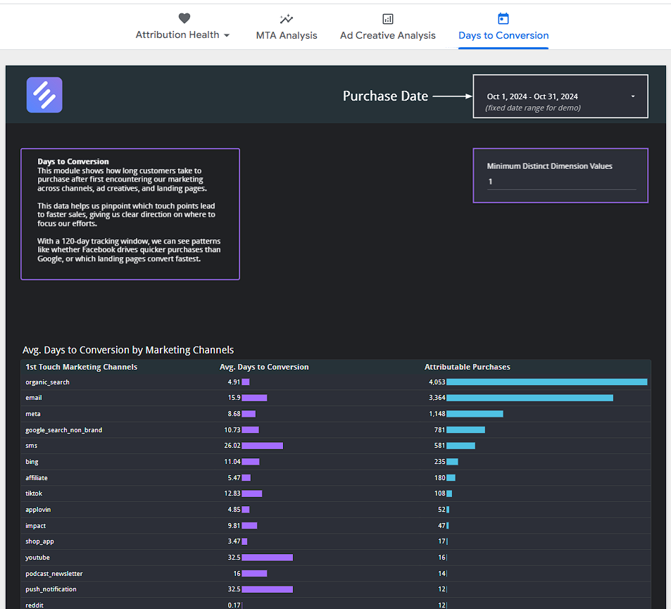 SourceMedium MTA built-in reports are part of a standalone dashboard separate from your main SourceMedium dash. After MTA is enabled for your account, the dashboard link will be pinned to your shared Slack channel or sent via email/gchat if you do not use Slack. The sections below describe each of the default modules and their functionality.