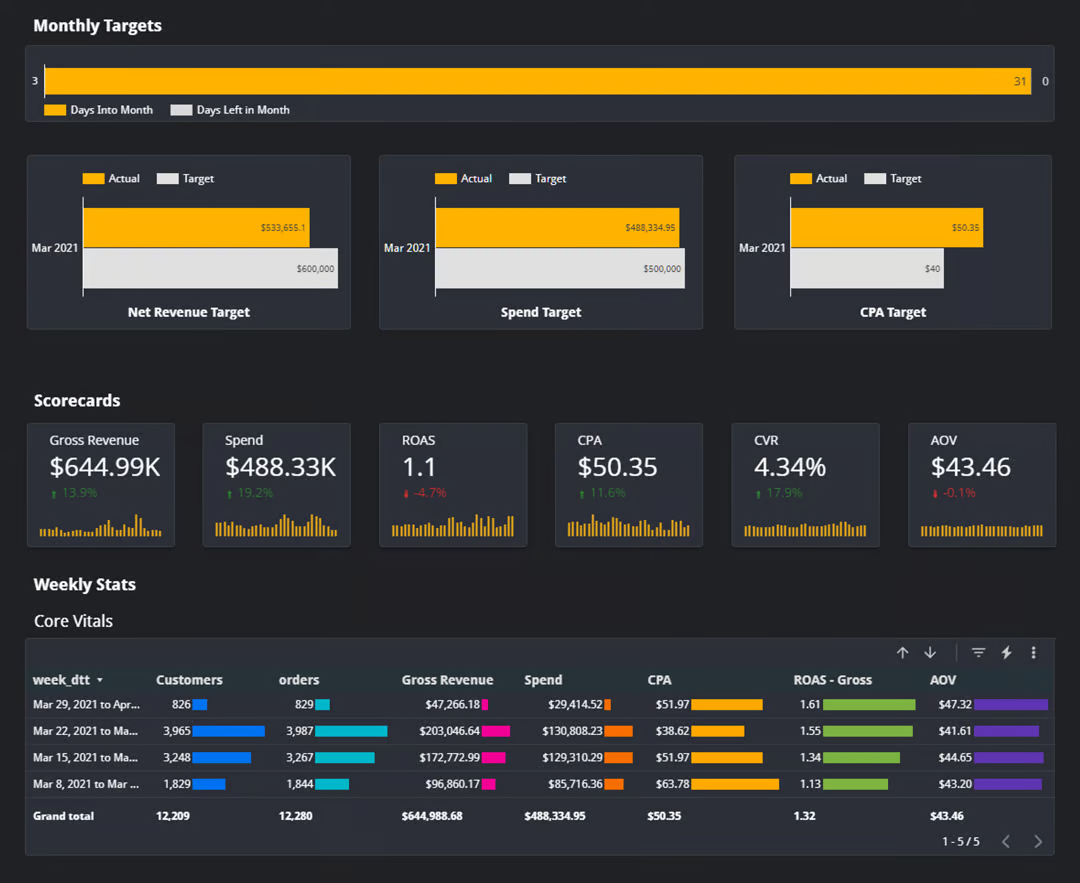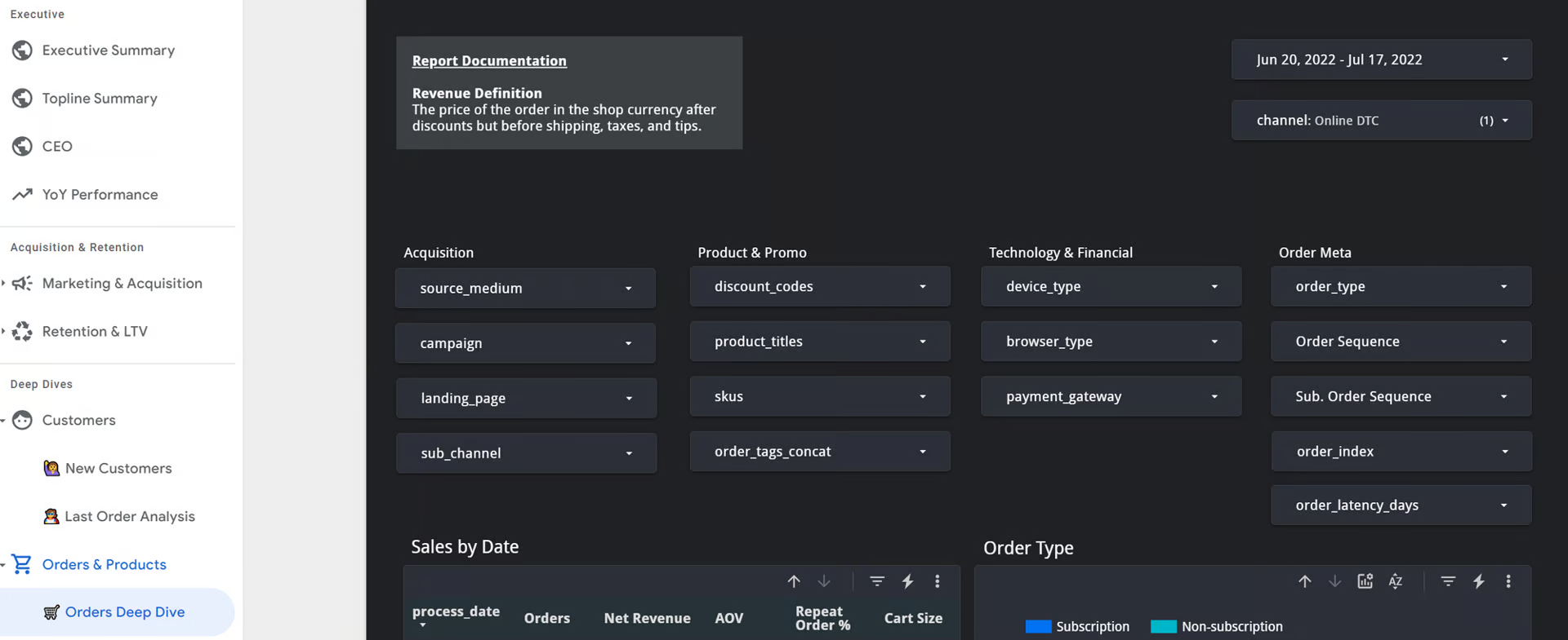 🧊 Will help uncover deep insights on your business Our dashboards are flexible, and like an iceberg will uncover more of our deep data layer as new use cases emerge. We intelligently aggregate multiple first-party data sources to analyze customers, orders, and products at a more granular level so you can run meaningful analysis vs. just high level reporting.